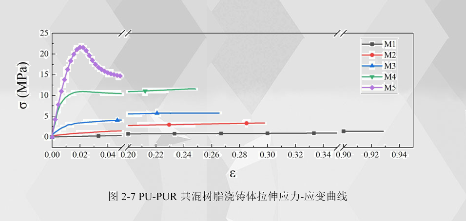 通過(guò)數(shù)值計(jì)算得到PU-PUR共混樹脂澆鑄體的拉伸應(yīng)力-應(yīng)變曲線如2-7所示。從曲線中可以看出,隨著聚脲所占比例的不斷增加,拉伸應(yīng)力-應(yīng)變曲線開始表現(xiàn)出更多的塑性形變特征,曲線上出現(xiàn)屈服階段,在M3、M4M5中,即聚脲成分占共混樹脂比例達(dá)到50%及以上時(shí)屈服階段表現(xiàn)地更明顯。同時(shí)由于聚脲所占比例的增加帶來(lái)硬段成分的增加,使得拉伸試樣相比于較低聚脲含量的樹脂澆鑄體所能承受的拉伸位移更短。