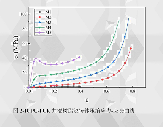 PU-PUR共混樹(shù)脂澆鑄體的壓縮應(yīng)力-應(yīng)變曲線如圖2-10所示,可以看出,M4M5聚脲樹(shù)脂澆鑄體在應(yīng)力-應(yīng)變曲線上出現(xiàn)了明顯的線彈性階段和屈服階段。在應(yīng)變達(dá)到0.39的時(shí)候M1聚氨酯和M5聚脲樹(shù)脂澆鑄體都已經(jīng)處于變形失效的狀態(tài),聚氨酯澆鑄體發(fā)生扭曲變形失效,聚脲澆鑄體發(fā)生脆性斷裂失效。而共混樹(shù)脂澆鑄體M2、M3M4在應(yīng)變達(dá)到0.5以上時(shí)才開(kāi)始逐漸失效且擁有更長(zhǎng)的平臺(tái)段,失效應(yīng)變分別為0.640.590.51。說(shuō)明在應(yīng)變率較大的情況下,M2、M3M4樹(shù)脂澆鑄體的壓縮力學(xué)性能 要強(qiáng)于單獨(dú)的M1聚氨酯和M5聚脲,可以承擔(dān)更大的壓縮位移而不失效。