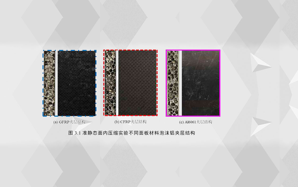 泡沫鋁夾層結構在汽車應用中所承載的另一種典型工況為面內壓縮,例如泡沫鋁填充引擎蓋、側門等,例如泡沫鋁填充的前縱梁,當汽車發生正面碰撞交通事故時,當沖擊速度較大時,引擎蓋、側門會發生較大的擠壓面內變形,而夾層結構在面內壓縮工況下的失效機理和吸能特性也是相當復雜的,為了推動夾層結構在汽車上的應用,對泡沫鋁夾層結構在面內壓縮工況下全面系統的研究是很有必要的。本章主要通過實驗的方法,揭示了不同配置的泡沫鋁夾層結構在準靜態面內壓縮工況下的結構響應機理、失效模式以及耐撞性能,得出何種配置的泡沫鋁夾層結構的耐撞性能更優,泡沫鋁夾層結構的配置參數主要包括面板材料、面板厚度、芯層高度和芯層密度。