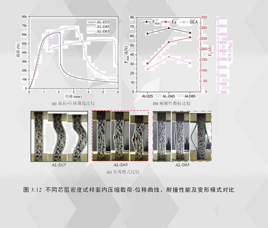 為了分析泡沫芯層密度的影響,選取芯層密度為0.25g/cm3,0.45g/cm3和0.65g/cm3的鋁合金夾層結構作為研究對象。圖3.12(a)和(c)為三種試件的載荷-位移曲線和變形過程的比較,從圖中可以看出,其載荷-位移曲線的相似性相較大。其中AL-D25和AL-D45在第一二階段的變化趨勢基本一致,區別在于前者出現整體屈曲,并且芯層剪切破壞明顯,載荷出現斷崖式下降;而后者的失效模式以面板屈曲為主,芯層并未出現明顯芯層破裂,所以試件整體的仍具備相對穩定的承載能力,雖說載荷也出現大幅度下降,但其下降的坡度遠沒有前者陡。對試件AL-D65而言,其載荷-位移曲線與其他兩個試件的主要差別在于第一階段和第二階段交界處附近載荷出現斷崖式下降,造成這種現象的原因是某一面板出現較大尺寸的屈曲,并伴隨著大面積膠層失效,此面板基本喪失了大部分承載能力,從而導致載荷劇減,而當另一面板再次出現屈曲時,載荷仍然出現斷崖式下降。雖然試件AL-D45也出現了面板屈曲現象,但與AL-D65不同的是,前者的兩面板幾乎同時出現屈曲失效,兩面板的承載能力不至于瞬間減低,雖說承載能力有所下降,但也并未出現斷崖式下跌,而且AL-D45的峰值載荷對應的位移大約在3mm,比AL-D65的1.3mm更遲,這也從另一方面解釋了前者具有更大的峰值載荷。有趣的是,雖然三者曲線相差較大,但三種試件在第一階段和第二階段的斜率是旗鼓相當的。