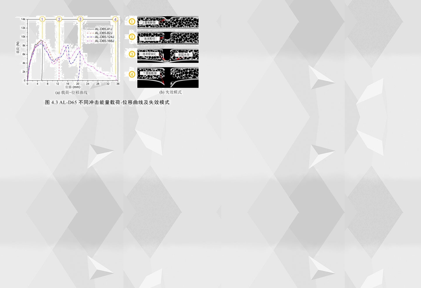 從圖4.3中AL-D65在166J沖擊能量下的載荷-位移曲線可以看出,其曲線有三個峰值載荷,結合各沖擊能量下的失效模式可以看出,AL-D65與AL-F2的失效機理有一定程度的相似性,兩者均是由于上面板裂紋的出現導致第一次峰值載荷下降以及下面板裂紋的出現導致最后一次峰值載荷下降,并且都由于泡沫芯層的密實化導致載荷在第一次波谷后繼續上升;而不同之處在于,AL-D65的下面板與膠層之間出現失效分離,如圖4.3(b)中③所示,再結合AL-D65的載荷-位移曲線可以看到,②與③之間存在一個峰值載荷,而導致AL-D65第二個峰值載荷下降的原因是由于下面板與膠層之間出現失效分離。