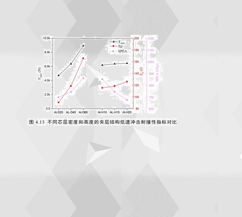 根據各配置的試件在穿透能沖擊下的載荷-位移曲線,計算得出各耐撞性指標比較如圖4.13所示,可以看出,隨著夾層結構芯層密度的上升,其耐撞性能明顯提高,芯層密度從0.25g/cm3增加到0.65g/cm3,夾層結構的初始峰值載荷增加89%,穿透吸能提高82%,比穿透能提高23%;對芯層高度而言,試件的芯層高度從10mm增加到20mm,其初始峰值載荷和穿透吸能均只有小幅增加,特別是初始峰值載荷,增加的幅度基本忽略不計,而其比穿透能反而明顯降低,大約下降了25%。